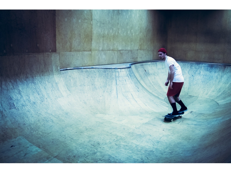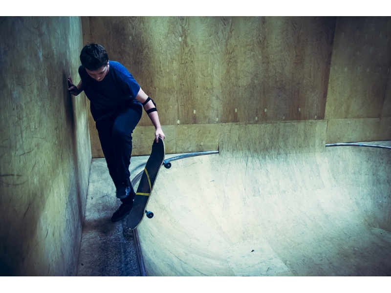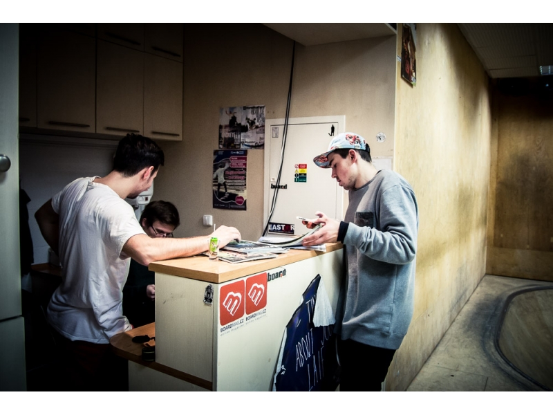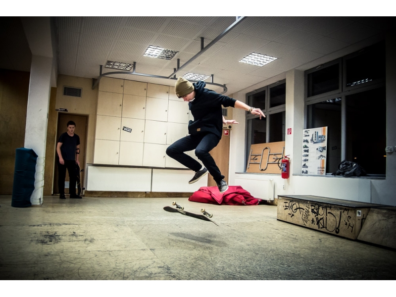 skejteri si vo vnútorných priestoroch Výmenníka Ľudová zdokonaľujú svoje zručnosti a techniku jazdy na skejtborde.